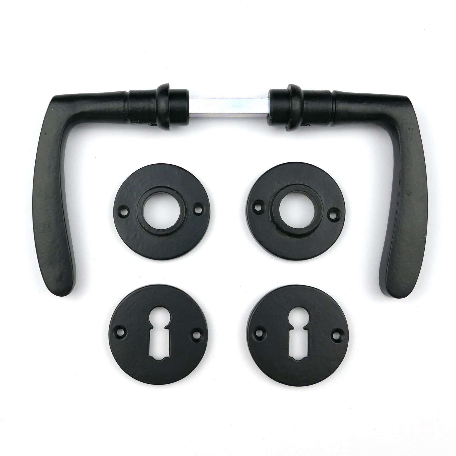 Für die schlichtere Wohnung haben wir 20er-Jahre Beschläge geliefert und zwar Rosettengarnituren, die Türdrücker, Türklinken und Türbeschläge enthalten. Sie sind original antik, schwarz und aus Eisen.
