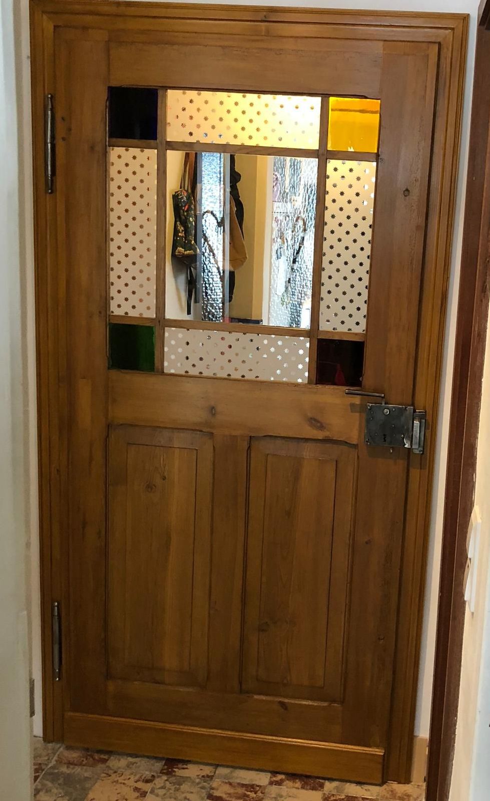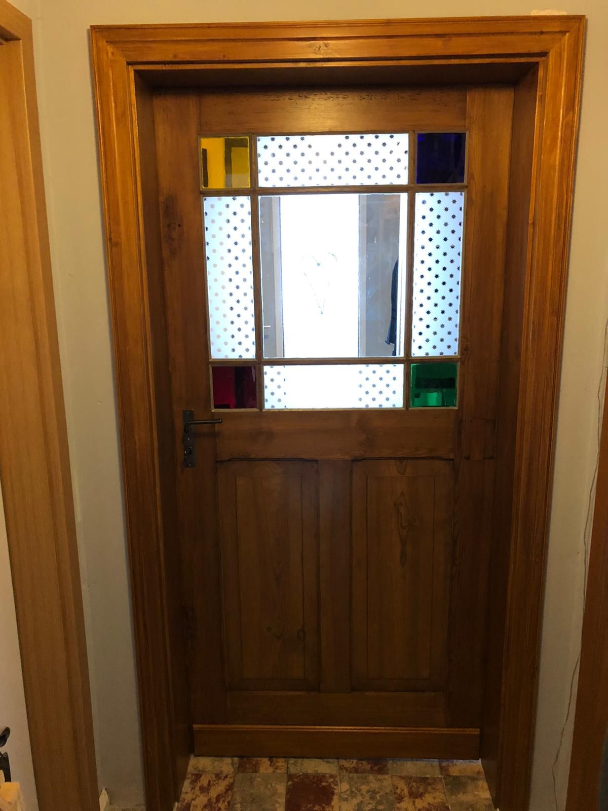 Die Zimmertür wurde einst mit viel Liebe zum Detail designt und handgefertigt. Sie verfügt über vier bunte Eckscheiben in gelb, rot, grün und blau. In der Mitte befindet sich eine größere klare Glasscheibe. Die Glasbänder sind sandgestrahlte Musselinscheiben mit Sternenmuster.