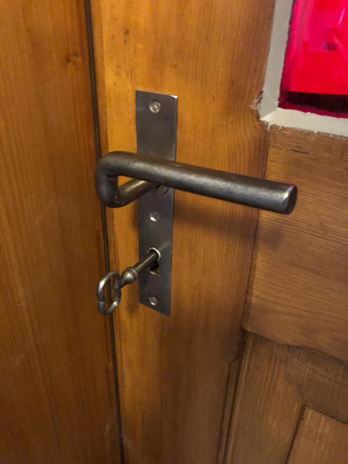 Die Tür ist ausgestattet mit einem Kastenschloss mit einem Stangengriff, mit einem Schlüssel und einem Langschild.