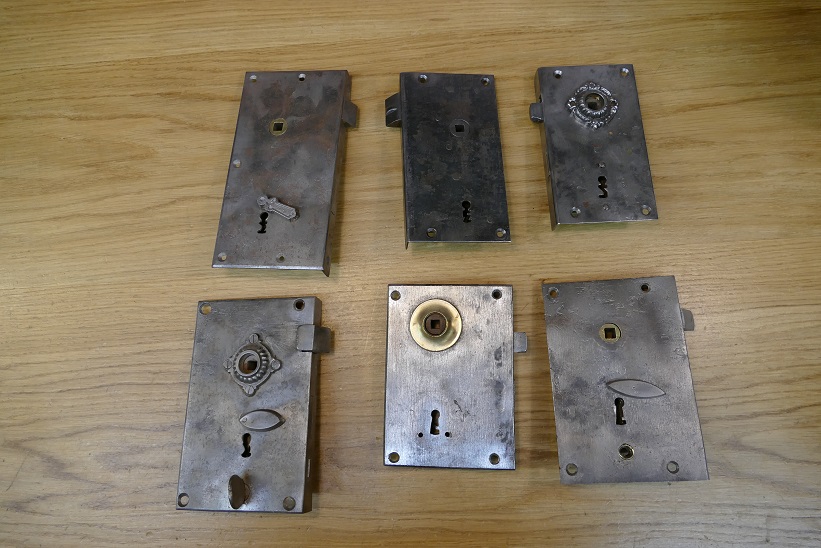 diese eisernen Einstemmeinsteckschlösser befinden sich im hervorragend restaurierten Zustand und stammen aus den 1850er Jahren.