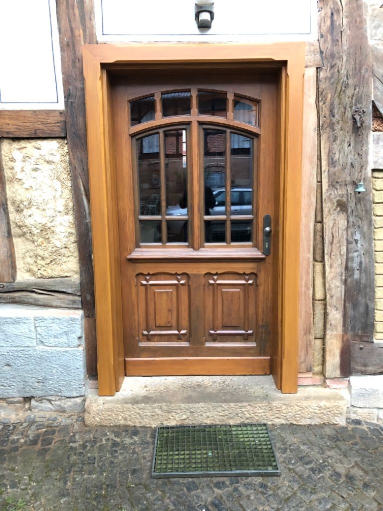 An den Sanierungsarbeiten eines solchen Gehöfts, das im Ebsdorfer Grund steht, waren wir beteiligt. Wir haben die Haustür des großzügigen Bauernhauses restauriert und hübsch gemacht.