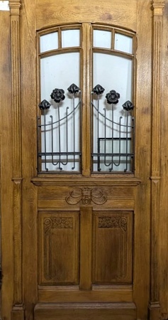 Antike Türen - Zweiflügel-Haustür aus Eiche im Jugendstil mit einem Segmentbogenfenster und einem wunderschönen Gitter mit Blumenapplikationen. Zwei passende Schlagleisten sowie geschnitzte Motive verzieren diese historische Tür.