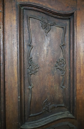 Antike Türen - Zweiflügel-Haustür aus Eiche, Rokokostil, reichlich verziert. Die Türfüllungen sind gebaucht. In der Mitte der Tür sind zwei originale Türknäufe angebracht.