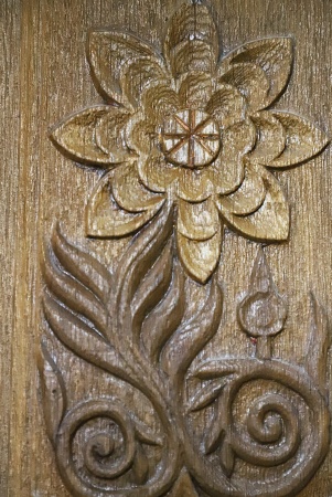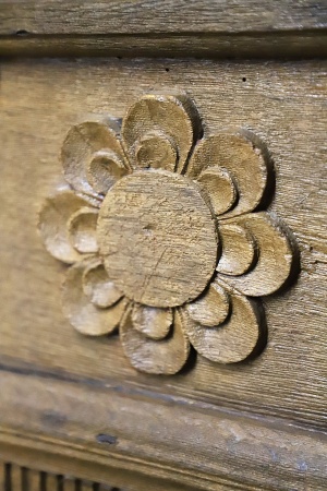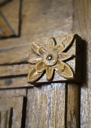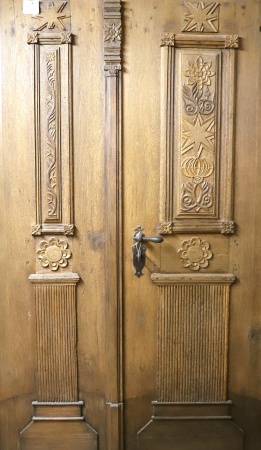 Antike Türen - Zweiflügel-Haustür aus Eiche im Klassizismusstil mit Blumen- und Sternmotiven verziert. Die unteren Füllungen haben Rillen.